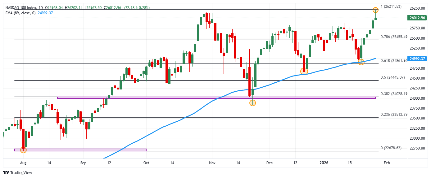 - El Nasdaq 100 sube un 0.28% el día de hoy, alcanzando nuevos máximos históricos en 26.202.