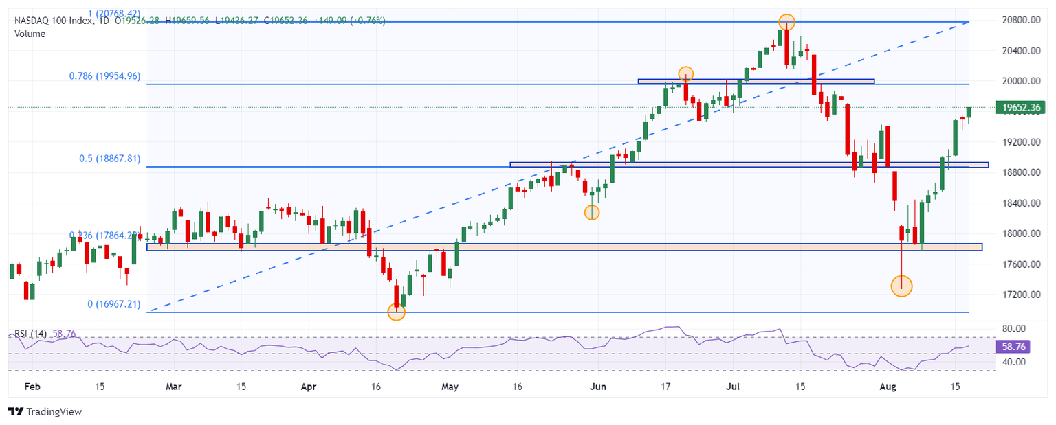 El Nasdaq 100 se encuentra una clara tendencia alcista, estableciendo un soporte en 18.832, dado por el mínimo del 14 de agosto. El siguiente soporte se encuentra en 17.775, punto pivote del 8 de agosto en confluencia con el retroceso al 23.6% de Fibonacci. La resistencia más cercana se encuentra en 19.970, máximo del 18 de julio.