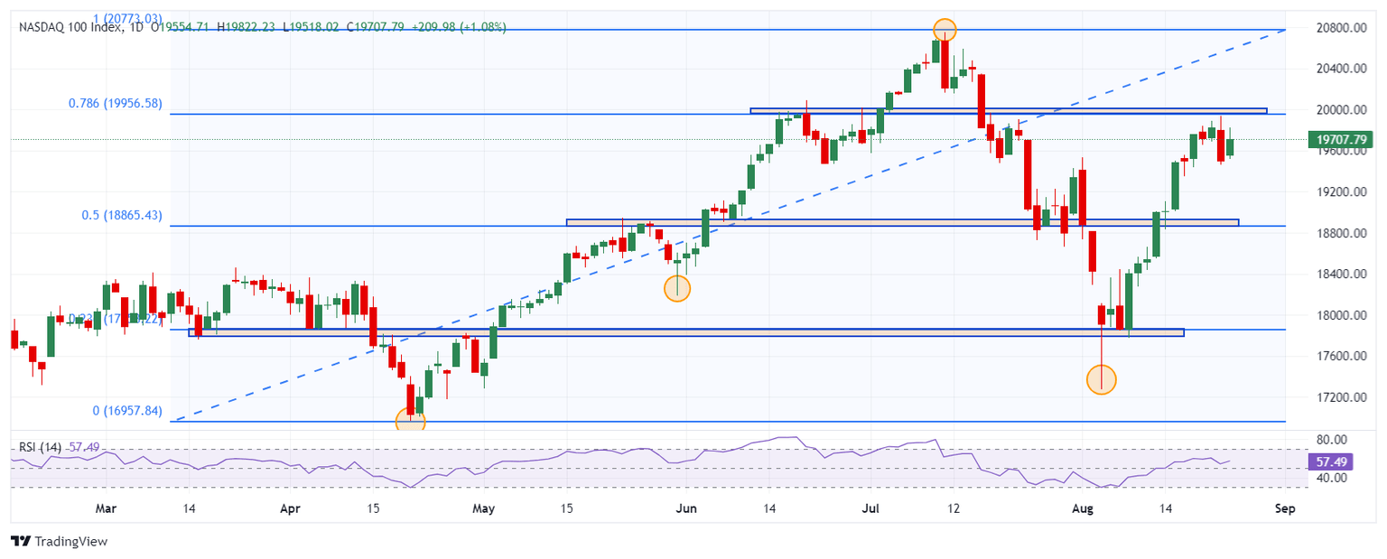 El Nasdaq 100 reaccionó al alza en un soporte de corto plazo ubicado en 18.800, dado por el mínimo del 14 de agosto en confluencia con el retroceso al 50% de Fibonacci. El siguiente soporte clave se encuentra en 17.270, punto pivote del 5 de agosto. La resistencia más cercana la observamos en 20.000, nivel psicológico que coincide con el retroceso al 78.6% de Fibonacci.