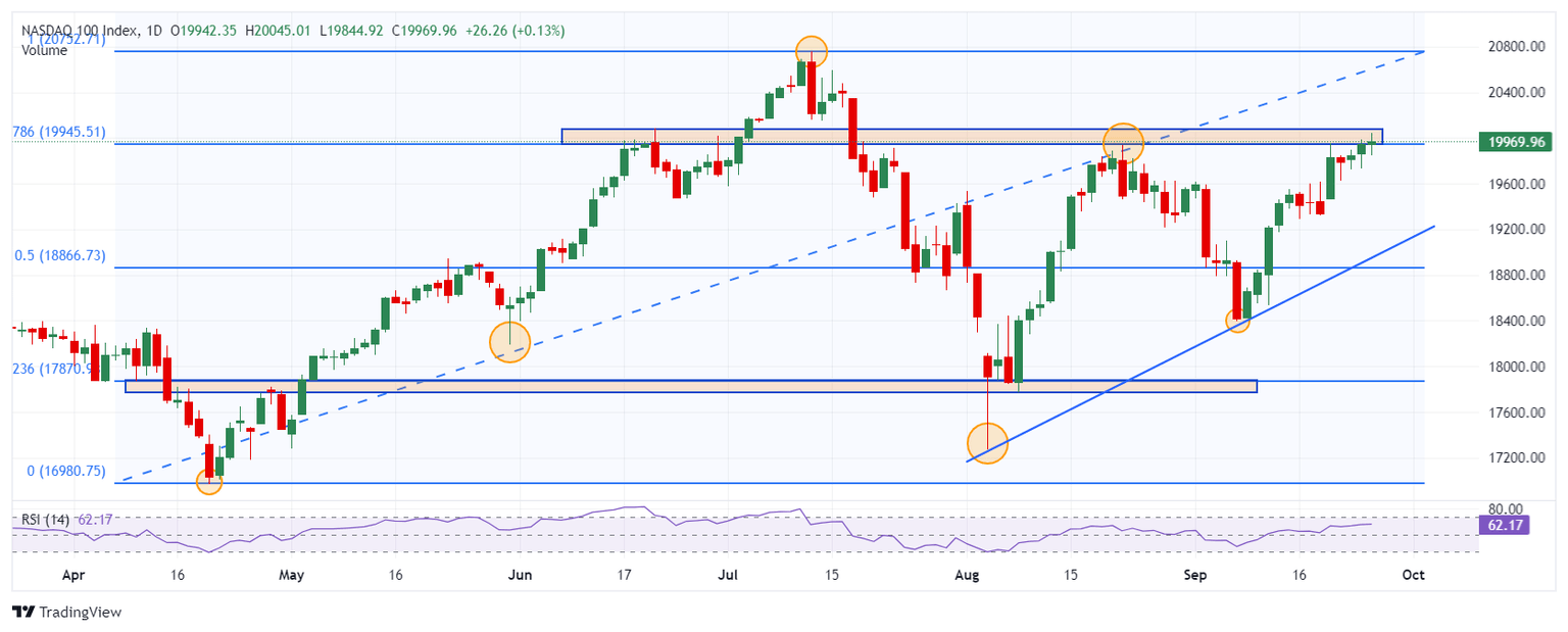 El Nasdaq 100 estableció un mínimo del día en 19.844, encontrando compradores que llevaron el índice tecnológico a un máximo diario en 20.045. Al momento de escribir, el Nasdaq 100 opera sobre 19.968, ganando un 0.15% en el día.