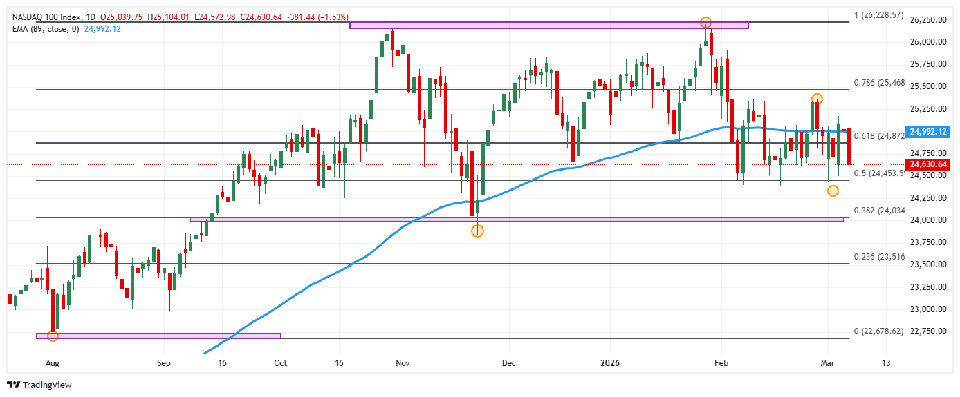 Ante este escenario, el Nasdaq 100 cae 380 puntos, llegando a mínimos del 4 de marzo en 24.572.