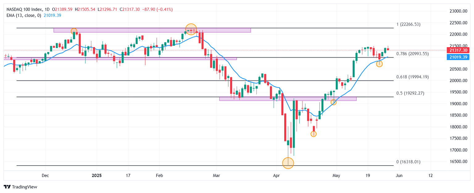 - El Nasdaq 100 retrocede un 0.41% el día de hoy, consolidándose dentro del rango operativo del 27 de mayo en 21.317.