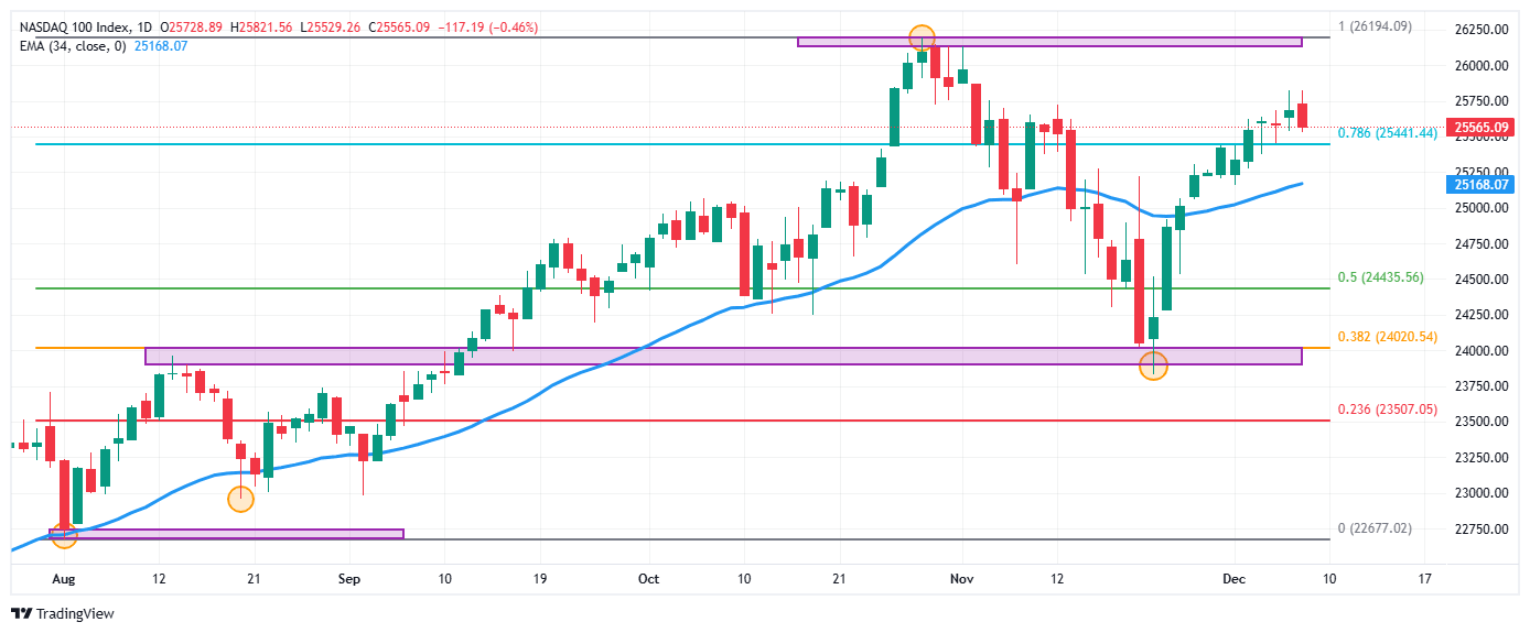 - El Nasdaq 100 pierde un 0.45% el día de hoy, alcanzando mínimos del 4 de diciembre en 25.529.