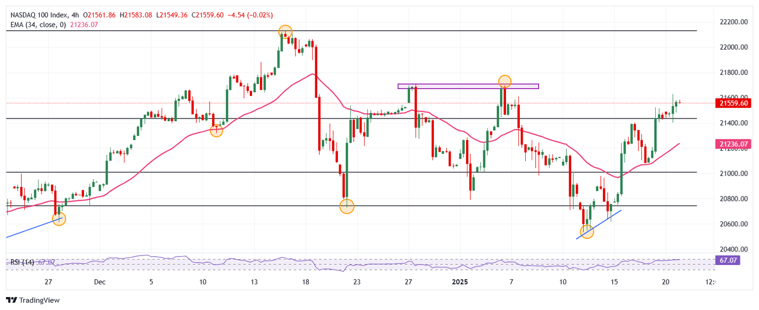 El índice tecnológico Nasdaq 100 registra su segunda sesión consecutiva al alza, llegando a máximos de dos semanas en 21.626 con intenciones de superar el máximo registrado el 16 de diciembre de 2024 en 22.131.