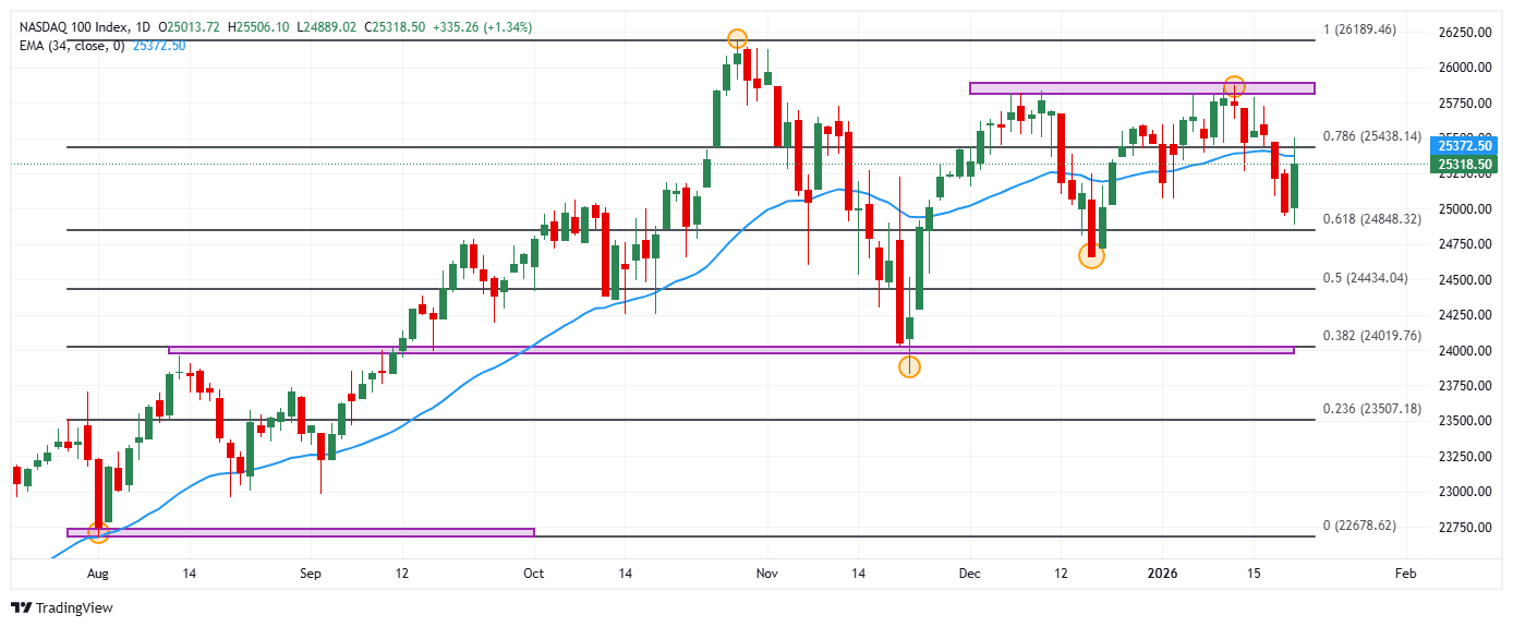 El Nasdaq 100 reaccionó al alza desde mínimos del 18 de diciembre de 2025 en 24.889, atrayendo compradores agresivos que impulsaron el índice a máximos del 16 de enero en 25.506. En estos momentos, el Nasdaq 100 opera en 25.317, subiendo un 1.34% diario.