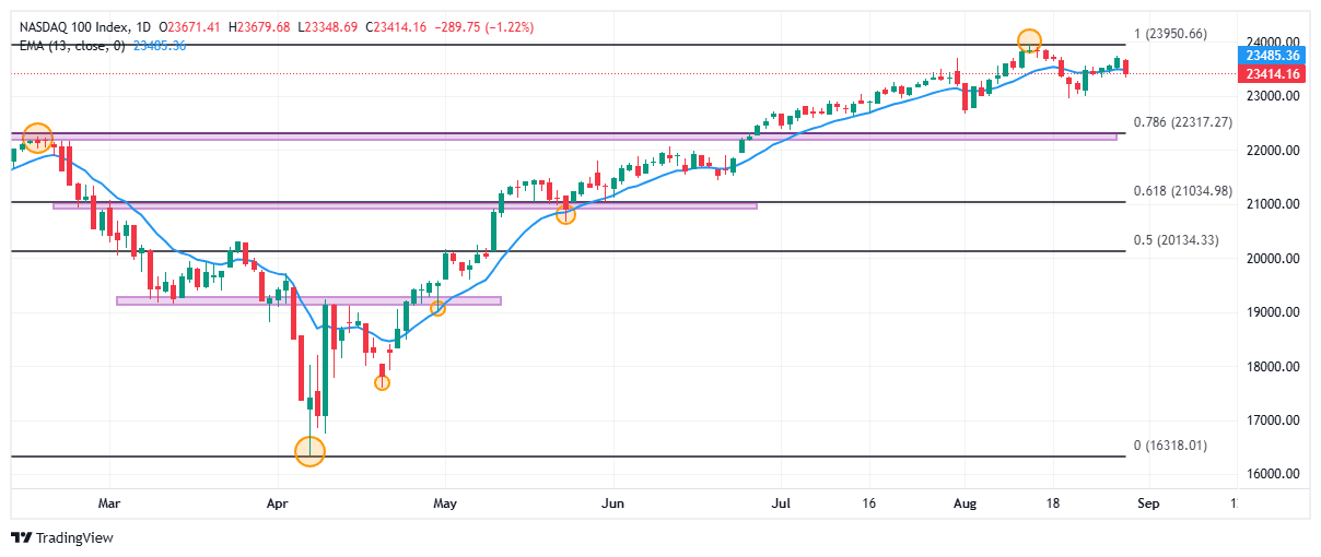 El Nasdaq 100 formó un soporte de corto plazo dado por el mínimo del 1 de agosto en 22.671. El siguiente soporte importante está en 20.675, punto pivote del 23 de mayo en convergencia con el retroceso al 61.8% de Fibonacci. Al alza, La resistencia más cercana se encuentra en 23.965 máximo del 13 de agosto.