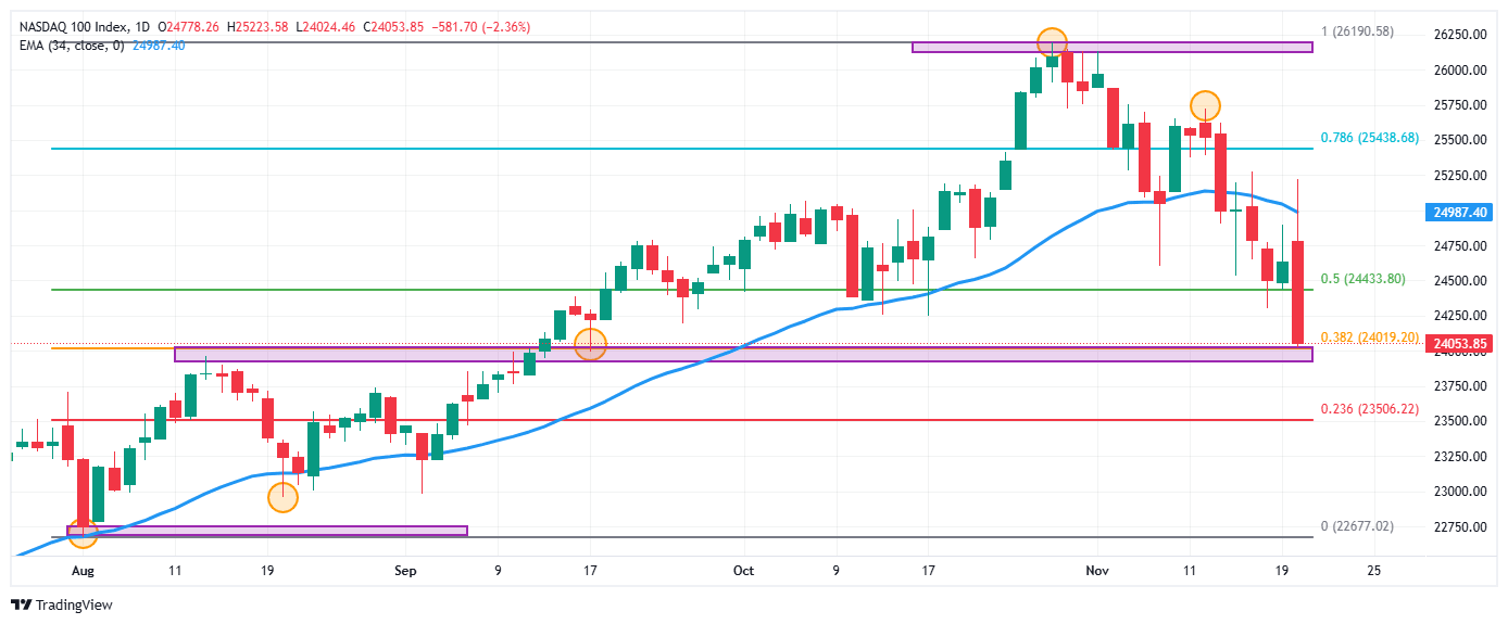 El Nasdaq 100 registró un máximo del día en 25.223, encontrando vendedores agresivos que llevaron el índice a mínimos del 17 de septiembre en 24.024. Al momento de escribir, el Nasdaq 100 opera en 24.053, perdiendo un 2.36% en el día.