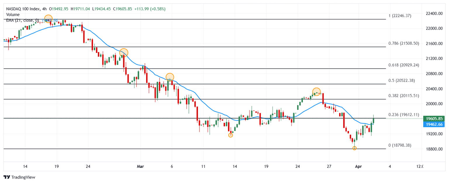 El Nasdaq 100 estableció un mínimo diario en 19.145, atrayendo compradores que impulsaron el índice a máximos del 28 de marzo en 19.711. Actualmente, el Nasdaq 100 cotiza en 19.580, ganando un 0.72% diario.