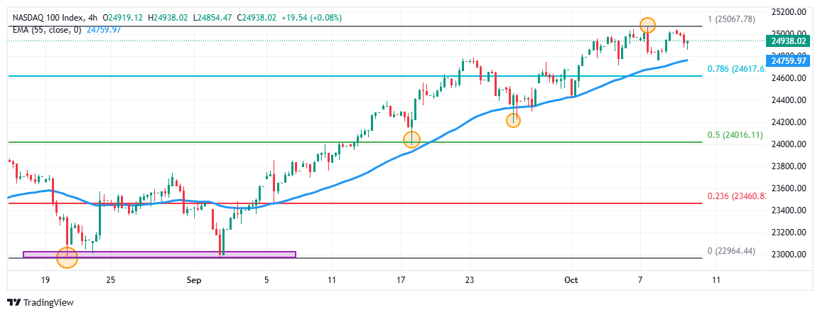- El Nasdaq 100 retrocede un 0.28% el día de hoy, manteniéndose dentro del rango del 8 de octubre en 24.938.