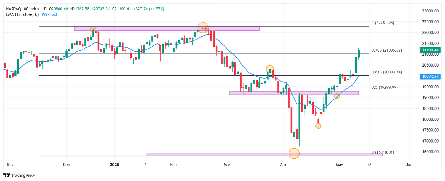 - El Nasdaq 100 gana un 1.57% el día de hoy, visitando máximos del 27 de febrero en 21.262.