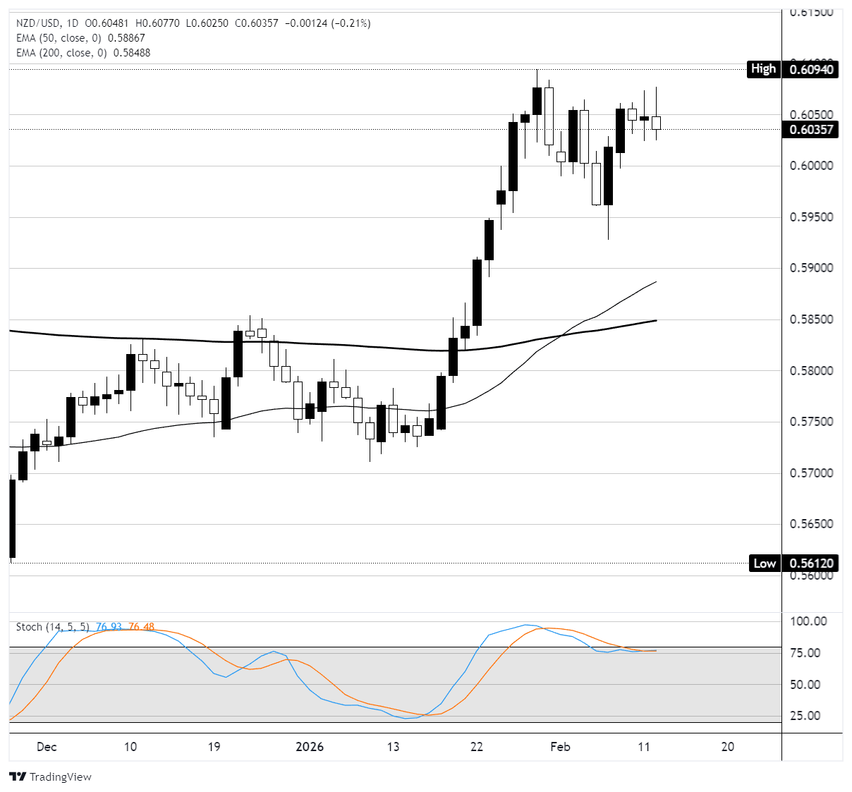El Dólar Neozelandés se fortaleció a alrededor de 0.6057, su nivel más alto en dos semanas, mientras los mercados evaluaban la perspectiva de política del Banco de la Reserva de Nueva Zelanda (RBNZ) antes de su Declaración de Política Monetaria del 18 de febrero. Se espera ampliamente que el RBNZ mantenga la Tasa Oficial de Efectivo (OCR) en 2.25% después de recortar tasas en un total de 325 puntos básicos desde agosto de 2024. Los datos del mercado laboral publicados la semana pasada mostraron resultados mixtos, con el desempleo aumentando inesperadamente al 5.4% (un máximo en una década) mientras que el crecimiento del empleo del 0.5% superó la previsión del 0.3%, reforzando la opinión de que un aumento de tasas a corto plazo es poco probable. Westpac espera que el RBNZ adelante su primera subida de tasas proyectada a diciembre de 2026, un cambio modesto respecto a la guía anterior de mediados de 2027. Actualmente, los mercados asignan una probabilidad del 75% a un aumento de tasas para septiembre.