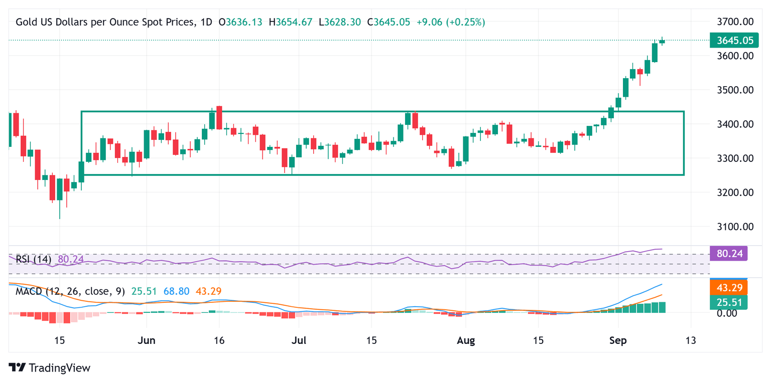 El Oro (XAU/USD) entra en una fase de consolidación alcista durante la sesión europea y se mantiene cerca de un nuevo máximo histórico, alrededor de la región de 3.659-3.660$ alcanzada más temprano este martes. Un tono generalmente positivo en los mercados de renta variable globales resulta ser un factor clave que impide a los operadores realizar nuevas apuestas alcistas en torno a la mercancía de refugio seguro en medio de condiciones de sobrecompra en gráficos a corto plazo. Sin embargo, la caída sigue estando amortiguada en medio del sesgo vendedor prevalente del Dólar estadounidense (USD).