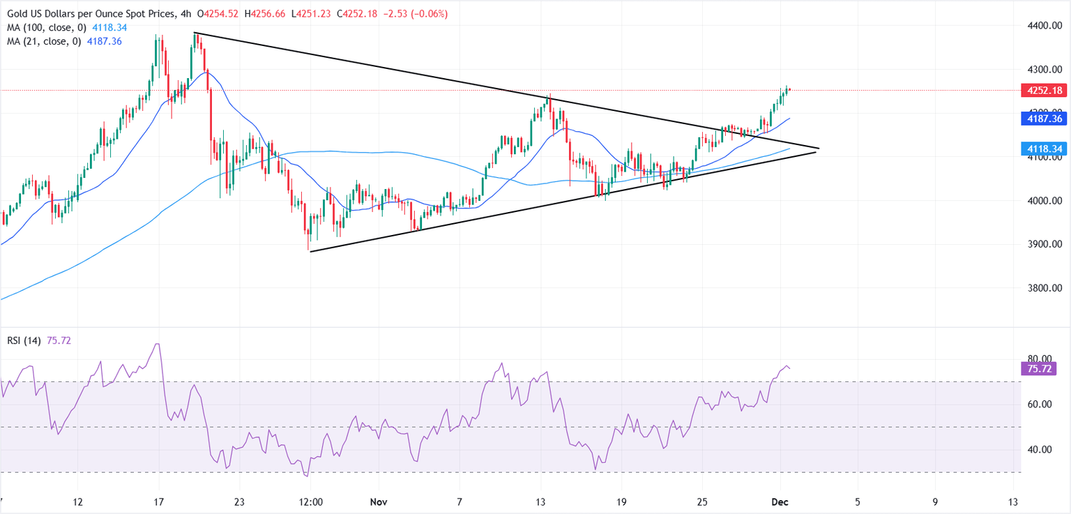 En el gráfico de 4 horas, el Oro ha confirmado una ruptura exitosa por encima de un patrón de triángulo simétrico bien definido, señalando una estructura de continuación alcista. La ruptura muestra un impulso en mejora, aunque la compra de seguimiento sigue siendo limitada por ahora, ya que el Índice de Fuerza Relativa (RSI) se mantiene en territorio de sobrecompra cerca de 77.