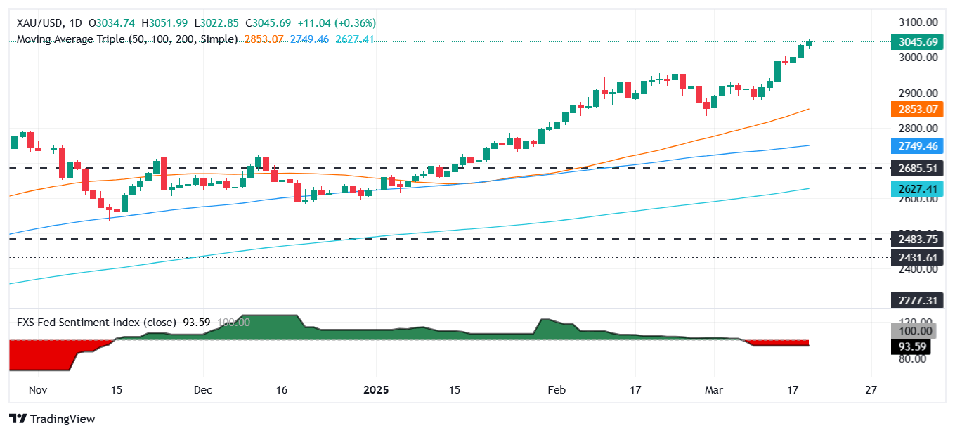 Los precios del Oro se dispararon y alcanzaron un nuevo máximo histórico de 3.052$ el miércoles, mientras el presidente de la Reserva Federal (Fed), Jerome Powell, hablaba tras la decisión de la Fed de mantener las tasas sin cambios. Al momento de escribir, el XAU/USD cotiza de manera volátil dentro del rango de 3.035$-3.050$, subiendo más del 0.20%.