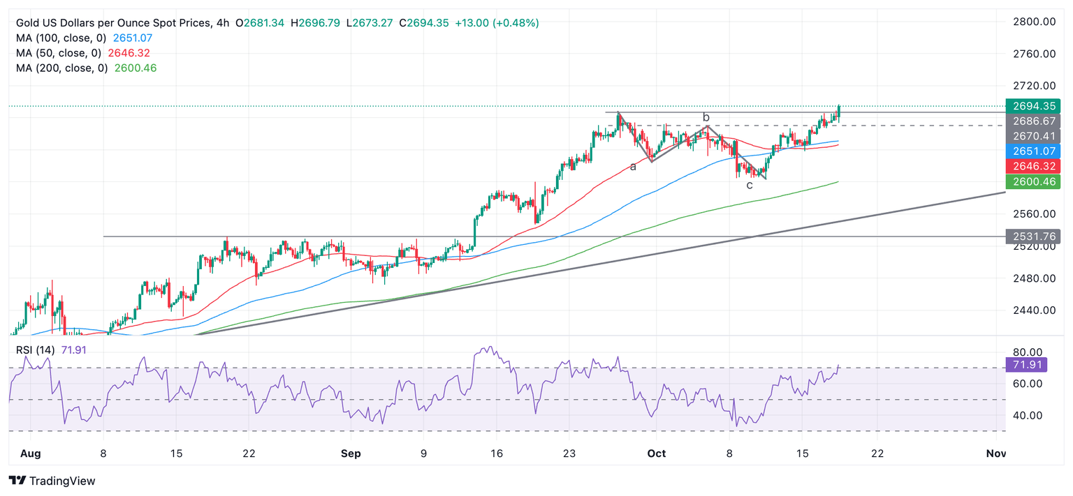 El Oro (XAU/USD) rompe a máximos más altos en los 2.690$ el jueves a pesar de sufrir un retroceso temporal tras la publicación de datos de ventas minoristas de EE.UU. más altos de lo esperado. Los datos tuvieron el efecto de fortalecer el Dólar estadounidense (USD), lo que ejerce presión sobre el Oro ya que ambos están negativamente correlacionados.