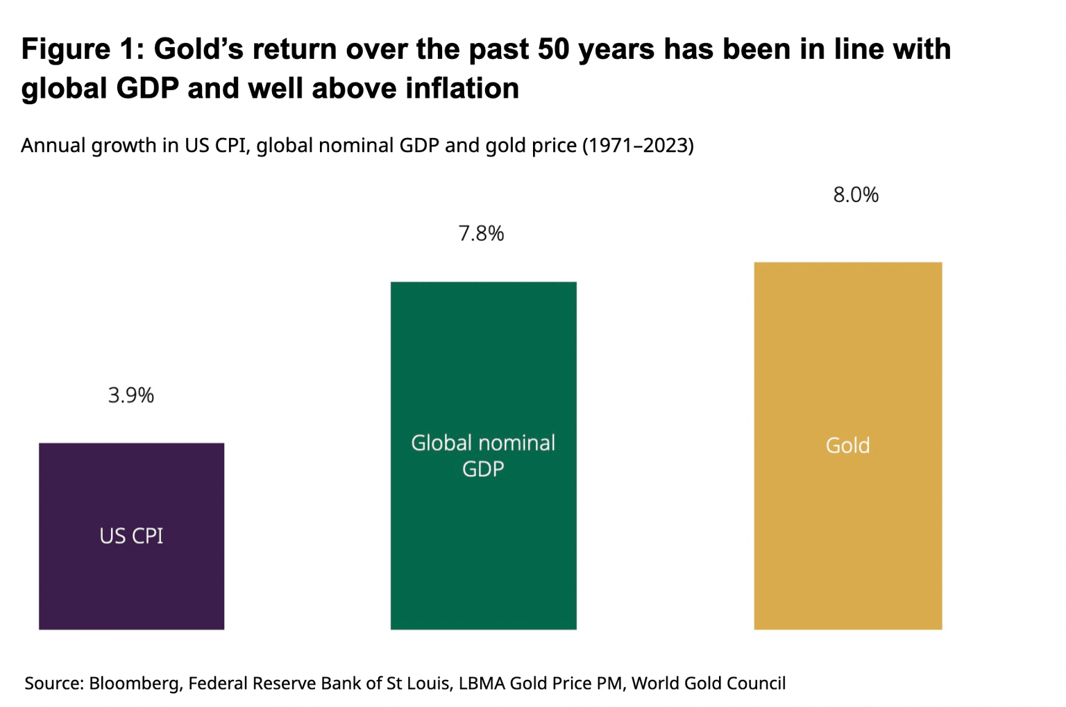 En cambio, el WGC argumentó que "el rendimiento a largo plazo del Oro ha estado muy por encima de la inflación durante más de 50 años (Figura 1), reflejando más de cerca el Producto Interior Bruto (PIB) global, un proxy para el motor de expansión económica utilizado en nuestros otros modelos de precios del oro."