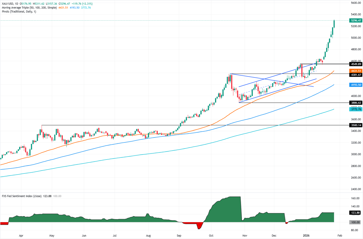 El rally del precio del oro se extendió, alcanzando nuevos máximos históricos durante ocho días consecutivos, en un movimiento parabólico que llevó al metal amarillo de alrededor de 4.600$ a un nuevo máximo histórico de 5.311$.