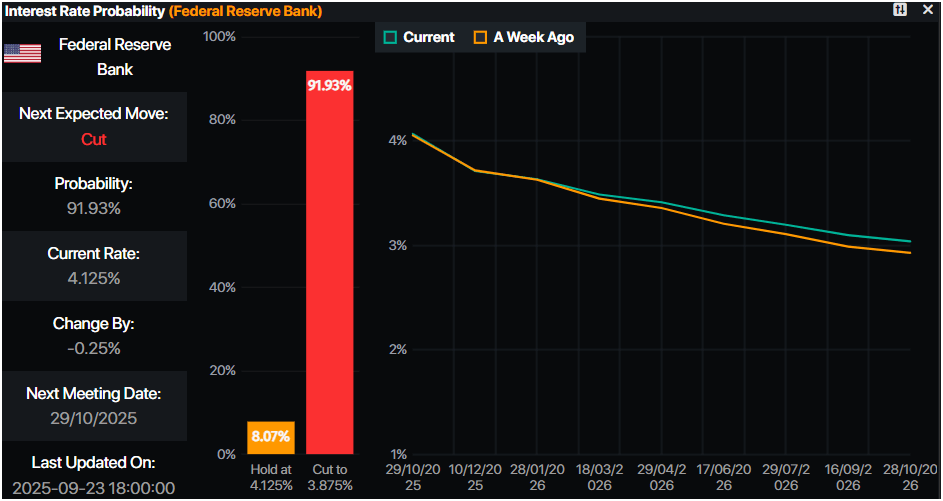 - Se espera que la Fed recorte tasas en 25 puntos básicos en la reunión del 19 de octubre, según revelan los datos de Prime Market Terminal. Las probabilidades están en 91%.