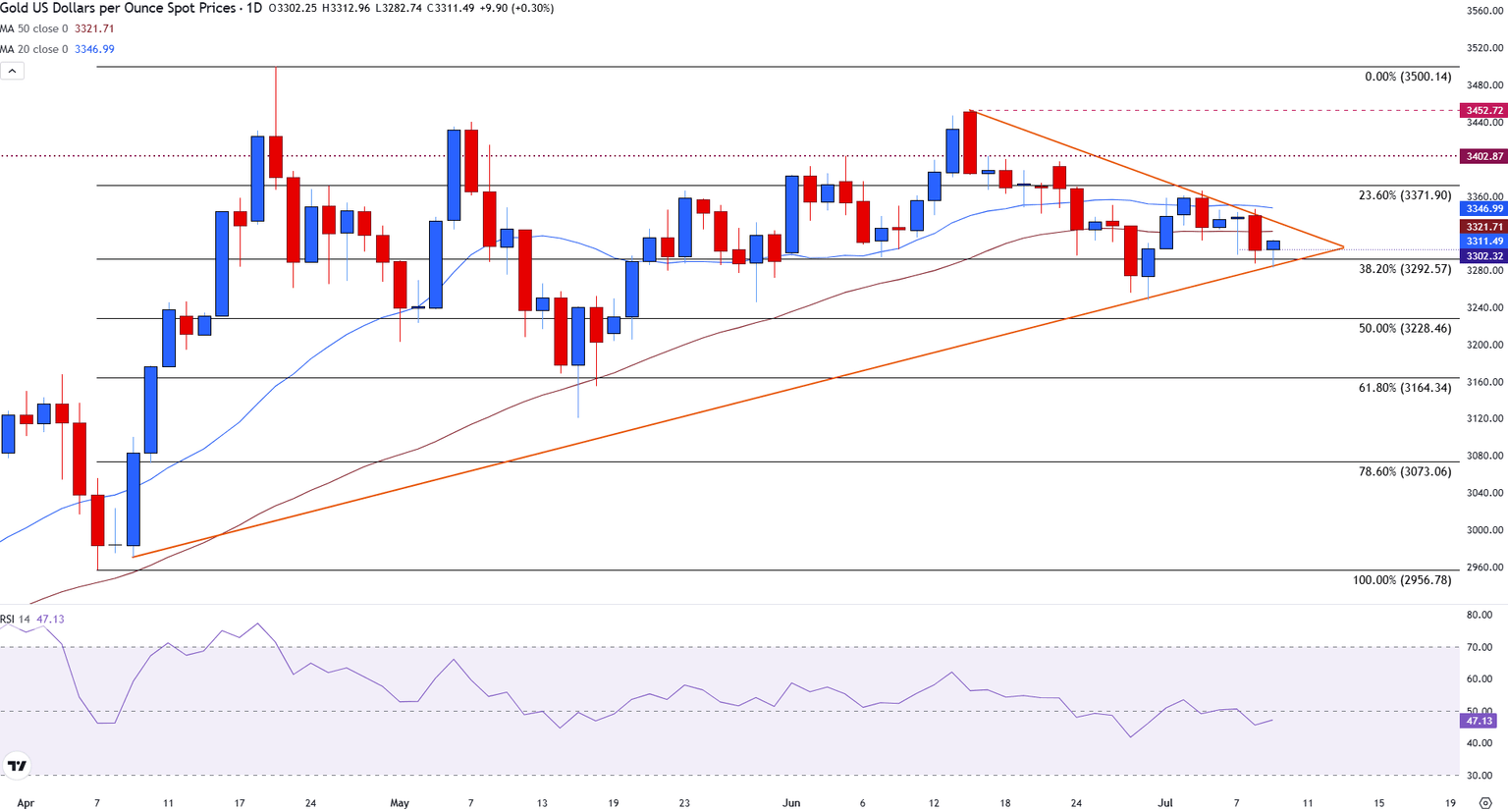 - El XAU/USD rebota desde el soporte del triángulo, con la SMA de 50 días proporcionando resistencia en 3.321$.