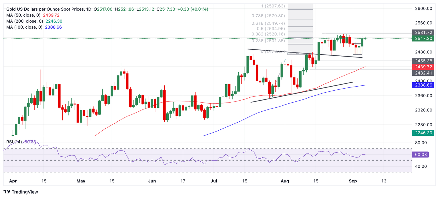 Una ruptura por encima del máximo histórico del 20 de agosto de 2.531$ proporcionaría más confirmación de una continuación al alza hacia el objetivo de 2.550$.