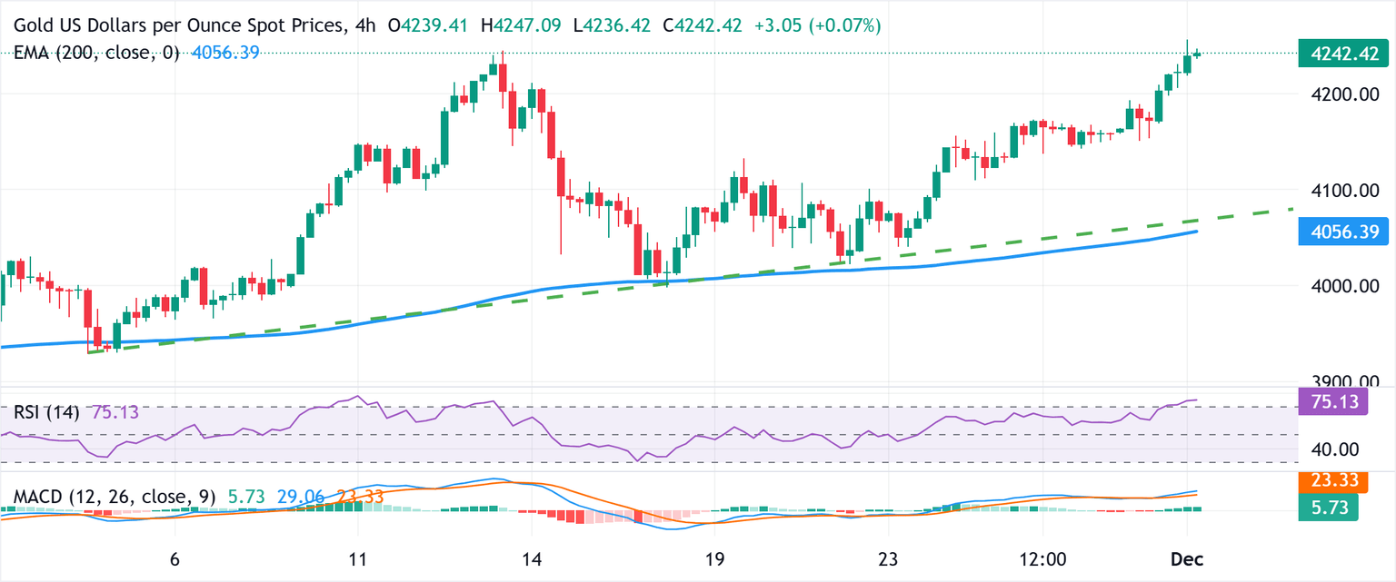 Por el contrario, el mínimo de la sesión asiática, alrededor del vecindario de 4.200$, ahora parece proteger la caída inmediata. Cualquier debilidad adicional podría verse como una oportunidad de compra y encontrar un soporte decente cerca de la región de 4.155-4.153$. Una ruptura convincente por debajo podría provocar algunas ventas técnicas y hacer que el precio del Oro sea vulnerable a acelerar la caída hacia el nivel de 4.100$ en ruta hacia la confluencia de 4.073$. Esta última comprende la media móvil exponencial (EMA) de 200 períodos en el gráfico de 4 horas y una línea de tendencia ascendente que se extiende desde finales de octubre.