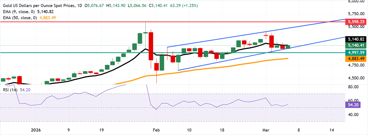 El precio del Oro (XAU/USD) se cotiza alrededor de 5.130$ al momento de escribir. El análisis técnico del gráfico diario sugiere un sesgo alcista en curso, ya que el precio del metal se mantiene dentro del patrón de canal ascendente.