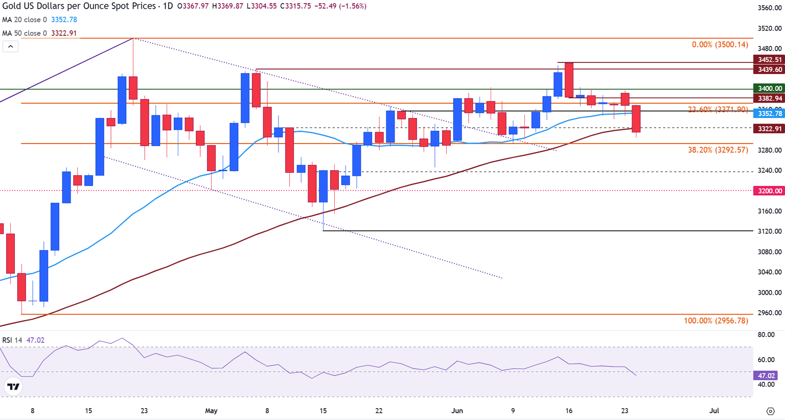 El XAU/USD se está cotizando actualmente cerca de 3.315$ después de caer por debajo de la media móvil simple (SMA) de 50 días el martes. La SMA de 50 días está proporcionando resistencia inmediata en 3.322$, con la SMA de 20 días formando una barrera adicional en 3.352$.