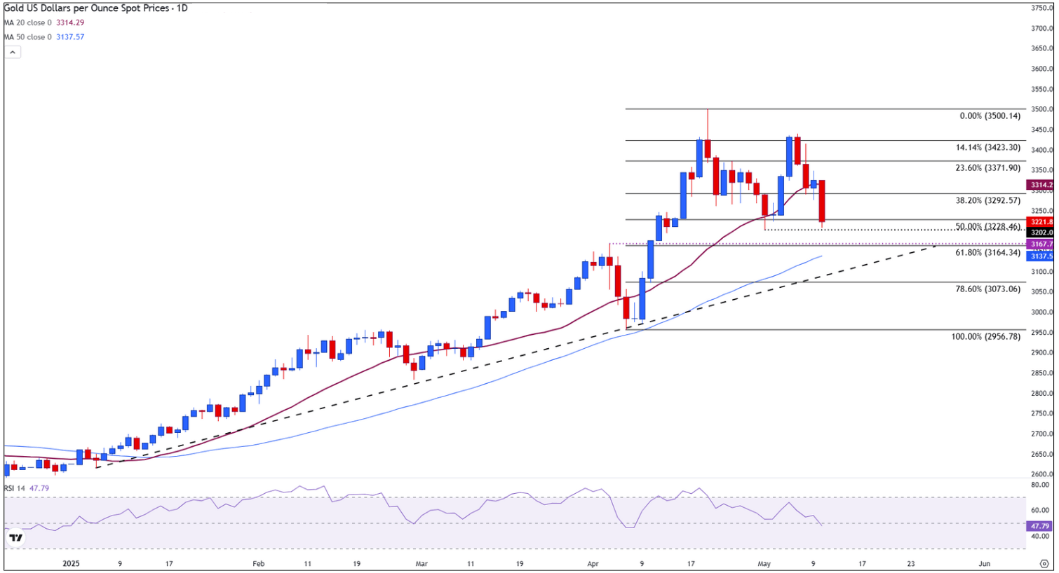 El siguiente soporte clave se encuentra en el nivel psicológico de 3.200$, una zona que se mantuvo durante el retroceso del 1 de mayo cuando el Oro probó brevemente 3.202$.