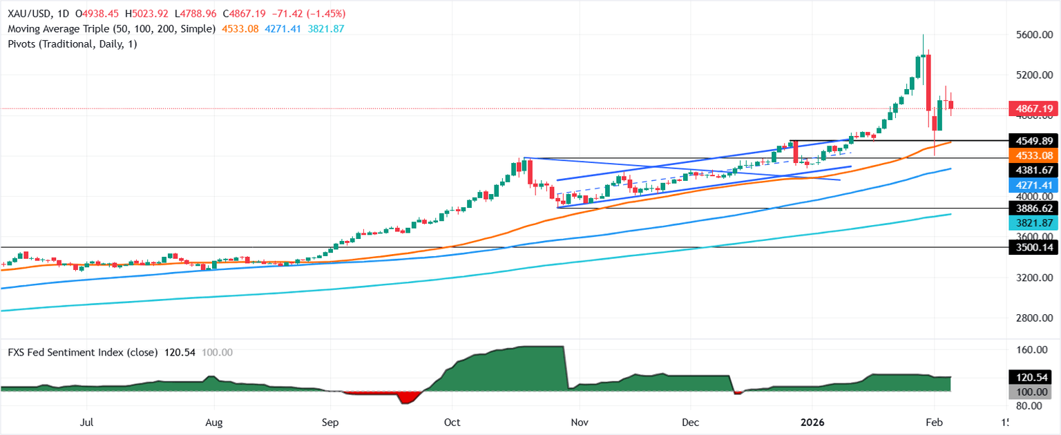 Para una continuación alcista, los compradores deben recuperar los 4.900$. Una ruptura de este nivel expondrá los 4.950$, seguidos de los 5.000$. Por el contrario, si el Oro cierra a nivel diario por debajo de la media móvil simple (SMA) de 20 días de 4.842$, podría agravar una caída hacia 4.800$. Una vez superado, la siguiente parada es 4.666$, el mínimo diario del 3 de febrero.