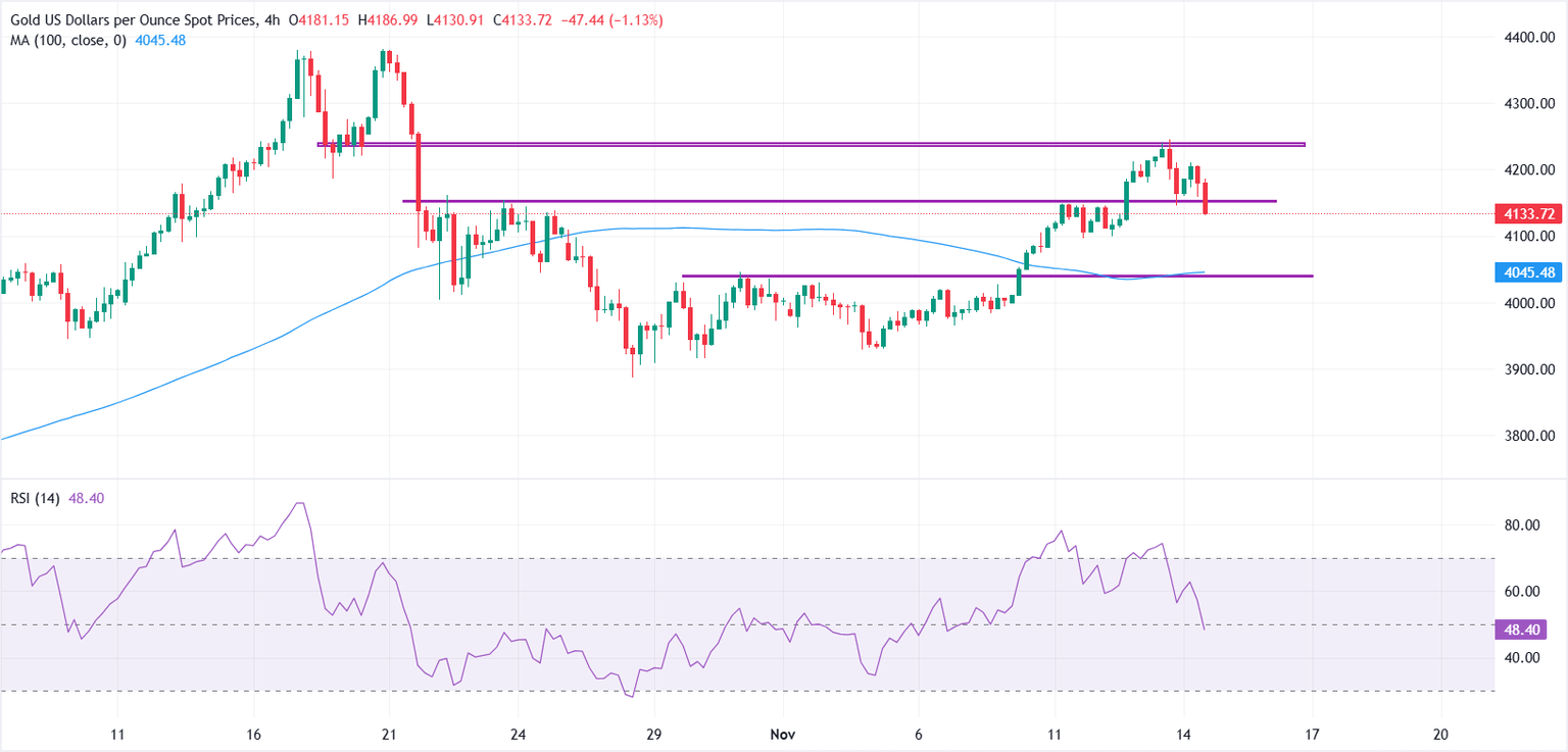 A la baja, la zona de 4.100$-4.120$ forma una zona de soporte inmediata, y un movimiento sostenido por debajo de esta área abre el riesgo de una caída hacia 4.050$, que se alinea estrechamente con la media móvil simple (SMA) de 100 períodos cerca de 4.045$, proporcionando un fuerte soporte técnico.