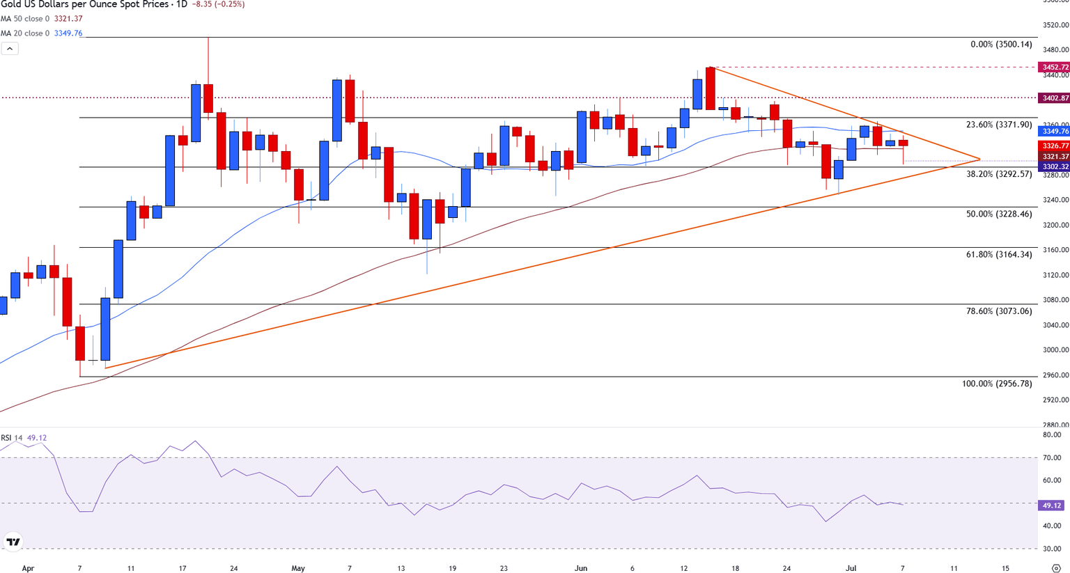 El gráfico diario actual del Oro muestra que la acción del precio se está consolidando dentro de un triángulo simétrico, sugiriendo que una ruptura es probable a medida que el rango se estrecha. Esta formación de ajuste refleja una creciente presión, que a menudo precede a un movimiento direccional significativo.