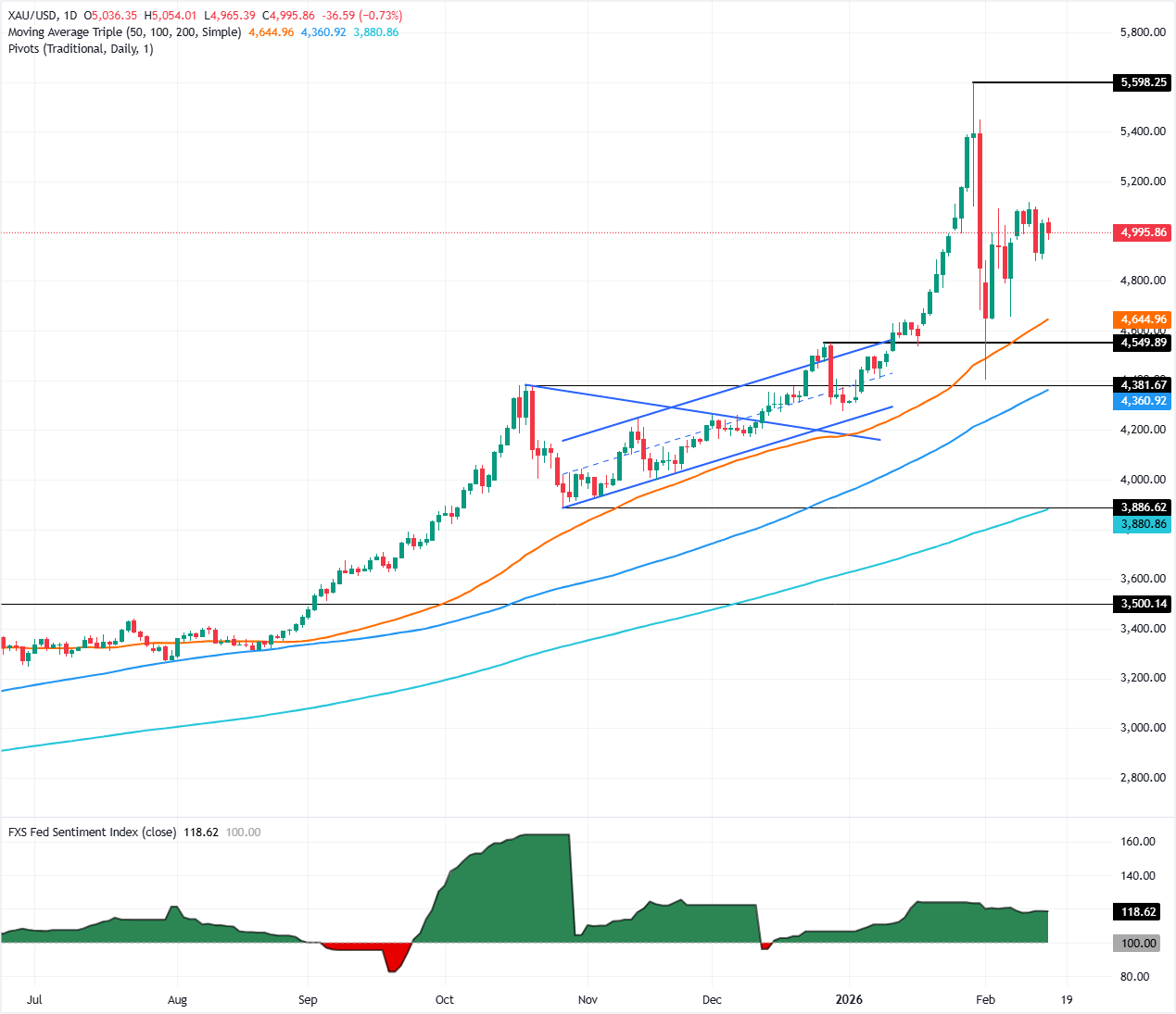 La imagen técnica muestra que los compradores de Oro están perdiendo impulso después de tres sesiones consecutivas de máximos más bajos que el pico del 11 de febrero de 5.119$, una señal de que los vendedores están defendiendo el nivel de 5.100$, llevando los precios a la baja.