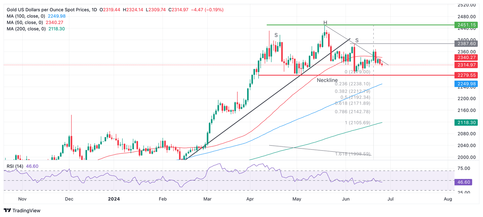 El Oro baja hacia un soporte clave y la línea de cuello de un posible patrón de techo en 2.279$ – una ruptura por debajo de ese nivel señalaría un fuerte movimiento a la baja.