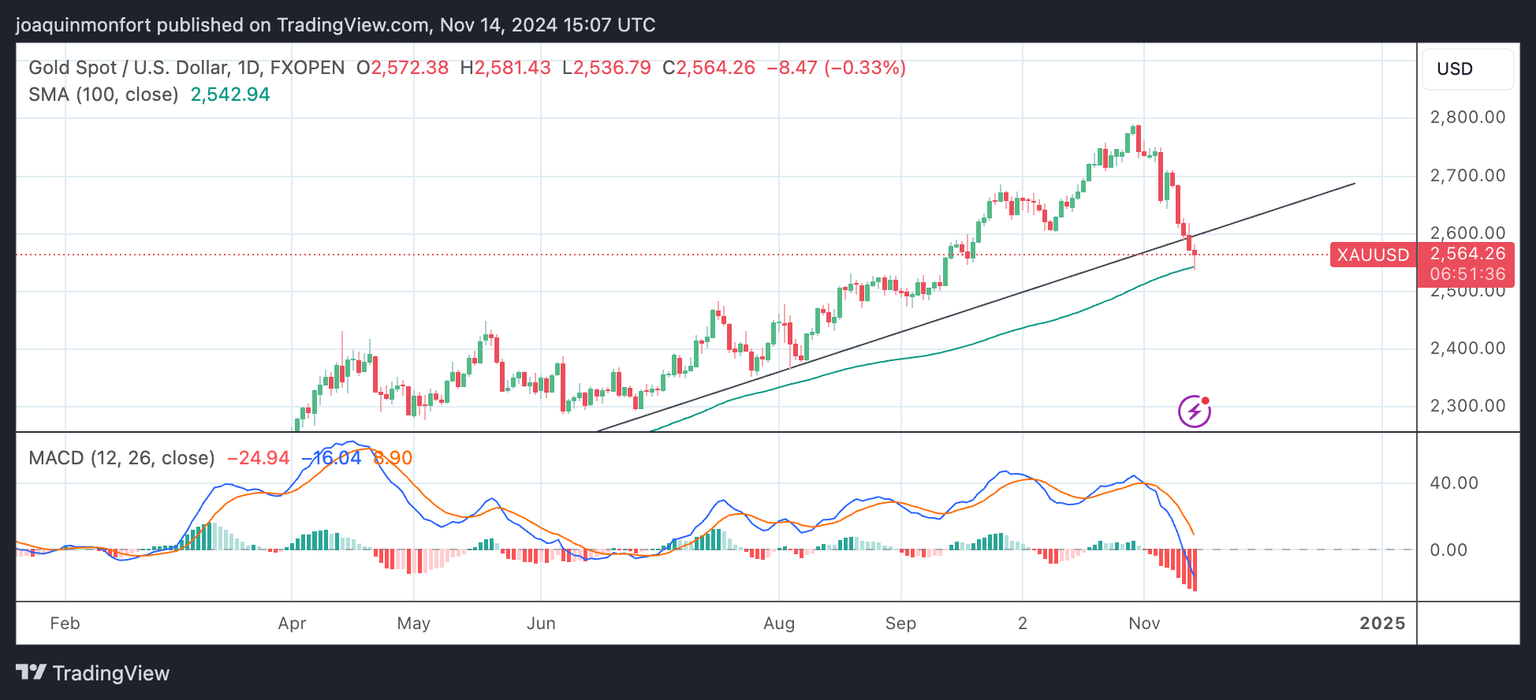 El metal precioso extiende aún más su caída el jueves, rompiendo por debajo de una línea de tendencia importante y alcanzando los 2.560$ después de la noticia de que el Partido Republicano ha ganado la mayoría en el Congreso de EE.UU., lo que significa que ahora controla la Casa Blanca, el Senado y la Cámara de Representantes.