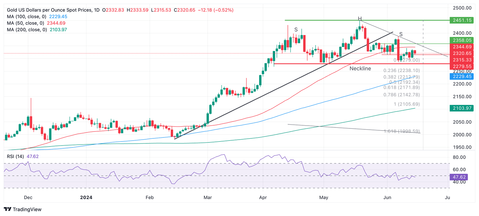 - El XAU/USD continúa formando un patrón bajista de hombro-cabeza-hombro en el gráfico diario.