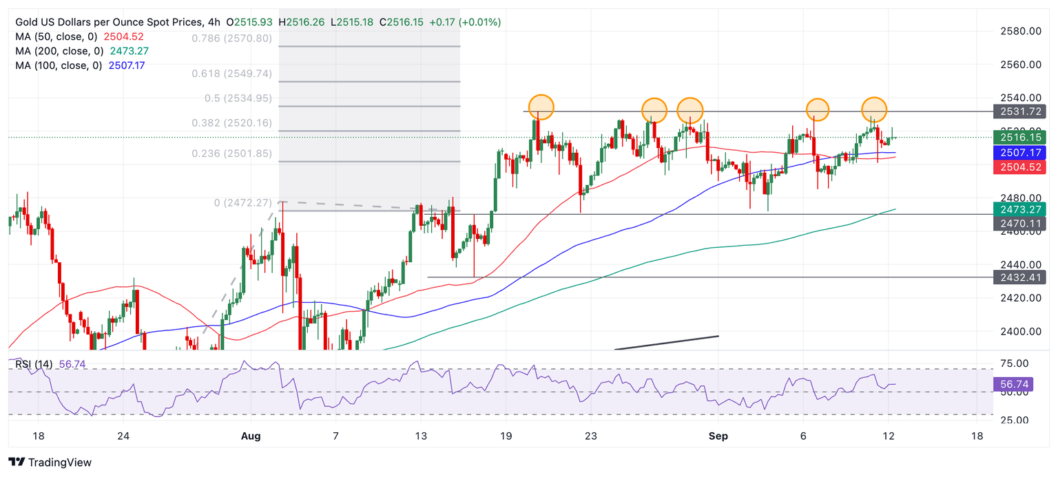 El Oro (XAU/USD) cotiza de nuevo en el medio de su rango lateral de varias semanas después de volver a probar brevemente el máximo histórico de 2.531 $ el miércoles.