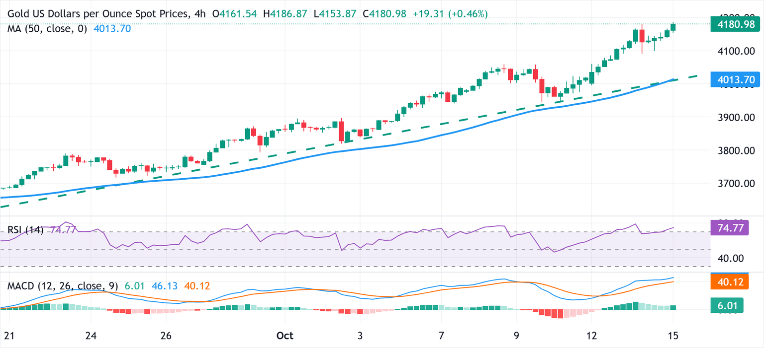 El Oro (XAU/USD) continúa alcanzando nuevos máximos históricos durante la sesión asiática del miércoles y parece estar listo para conquistar la cifra redonda de 4.200$ en un trasfondo fundamental de apoyo. Los inversores siguen preocupados por los riesgos económicos derivados de la prolongada guerra entre Rusia y Ucrania, las nuevas tensiones comerciales entre EE.UU. y China, y un prolongado cierre del gobierno de EE.UU. Este ha sido un factor clave que impulsa los flujos hacia el refugio seguro del metal precioso en medio de las expectativas dovish de la Reserva Federal (Fed).