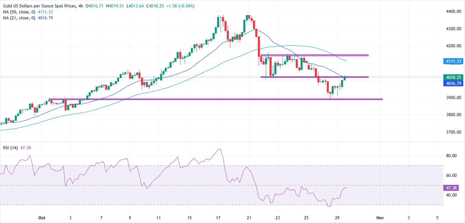El XAU/USD está intentando estabilizarse por encima de 4.000$, pero el rebote sigue siendo frágil. En el gráfico de 4 horas, la resistencia inmediata se observa en la zona de 4.020$–4.050$, un área de soporte anterior ahora reforzada por la media móvil simple (SMA) de 21 períodos. Una ruptura decisiva por encima de esta región podría abrir la puerta hacia la siguiente resistencia en 4.100$–4.150$, que se alinea con la SMA de 50 períodos.
