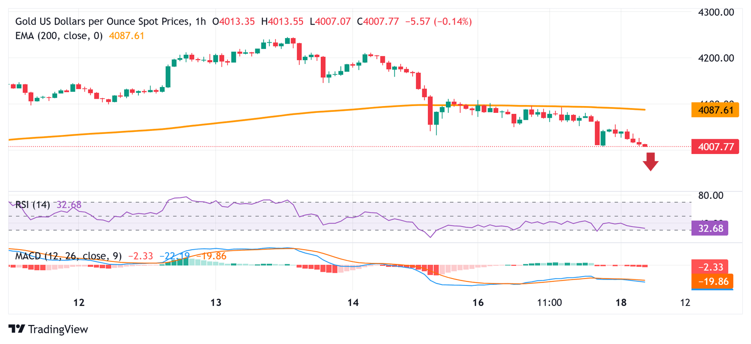 El par XAU/USD recientemente no logró volver a superar la media móvil exponencial (EMA) de 200 horas. La caída subsiguiente favorece a los bajistas y sugiere que el camino de menor resistencia para el precio del Oro es a la baja. Algunas ventas de seguimiento por debajo de la marca de 4.000$ reafirmarán el sesgo negativo y harán que la mercancía sea vulnerable a acelerar la caída hacia el soporte intermedio de 3.931$ en ruta hacia la marca de 3.900$ y el mínimo de finales de octubre, alrededor de la región de 3.886$.