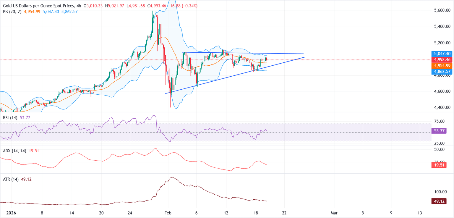 Desde una perspectiva técnica, el gráfico de 4 horas muestra que el precio se mantiene por encima de la media móvil simple (SMA) de 20 períodos, que también forma la banda media de Bollinger cerca de 4.954$, manteniendo la inclinación a corto plazo levemente favorable.
