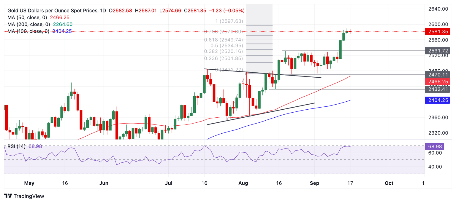 El Oro alcanzó un máximo histórico (ATH) de 2.589$ el lunes después de que las apuestas del mercado de que la Fed hará un recorte doble del 0,50% en las tasas de interés en su reunión del miércoles aumentaran drásticamente, según indicadores basados en el mercado.