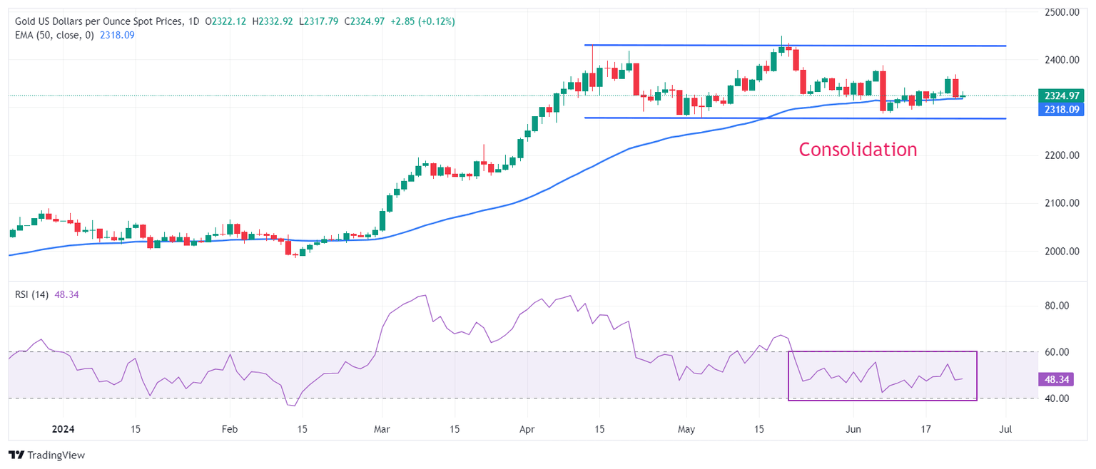 El precio del Oro se consolida entre 2.277$-2.450$ durante más de dos meses. La media móvil exponencial (EMA) de 50 días cerca de 2.318$ sigue proporcionando soporte a los alcistas del Oro. El RSI de 14 días oscila en el rango de 40.00-60.00, indicando indecisión entre los participantes del mercado.