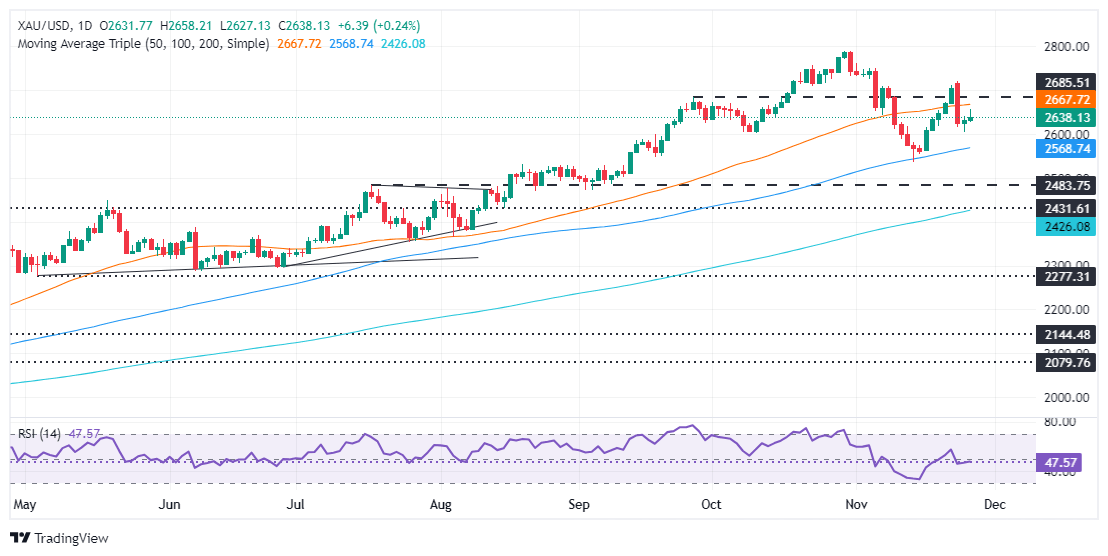 El precio del oro es neutral a sesgado a la baja después de que los vendedores empujaran al metal precioso por debajo de la marca de 2.700$. Aunque el metal dorado sube el miércoles, el XAU/USD está formando una serie de máximos y mínimos sucesivamente más bajos. Sin embargo, si los alcistas recuperan la SMA de 50 días en 2.667$, esto podría allanar el camino para desafiar los 2.700$, el nivel psicológico de 2.750$ y el máximo histórico de 2.790$.