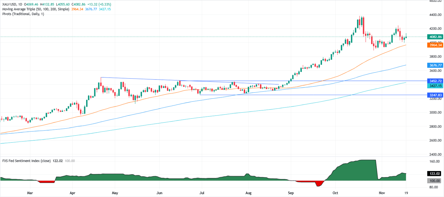 Si el Oro supera los 4.100$, los operadores podrían desafiar el nivel de 4.200$. Sin embargo, una caída por debajo de la SMA de 20 días lo haría vulnerable a un retroceso hacia 4.000$, seguido por el mínimo del 28 de octubre cerca de 3.886$.