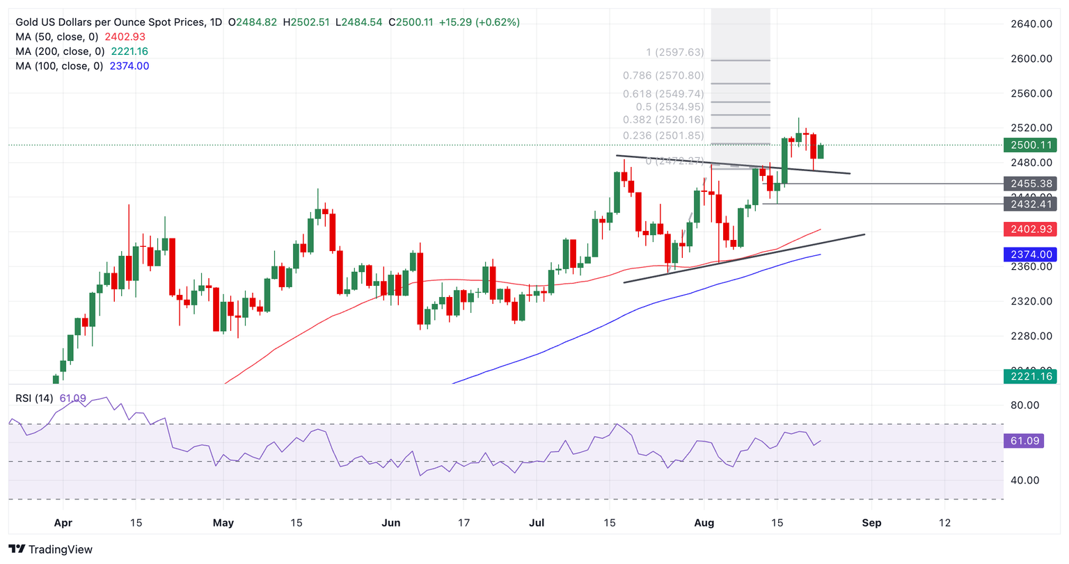 - El Oro encuentra soporte en los máximos anteriores del rango y rebota antes del discurso del presidente de la Fed, Jerome Powell.