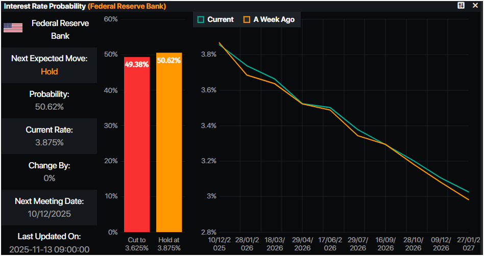 - Las posibilidades de un recorte de tasas de la Fed en la reunión de diciembre son un volado, con probabilidades de mantener las tasas en un 50%, según la Probabilidad de Tasa de Interés del Prime Market Terminal.