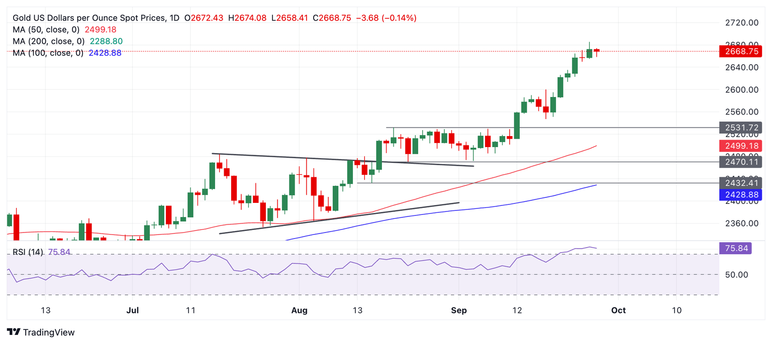 Dicho esto, el RSI puede permanecer sobrecomprado durante períodos de tiempo bastante largos en un mercado con una fuerte tendencia, y si el Oro rompe a máximos más altos, reconfirmará aún más el sesgo alcista del metal. Los próximos objetivos al alza son los números redondos de 2.700$ y luego 2.750$.