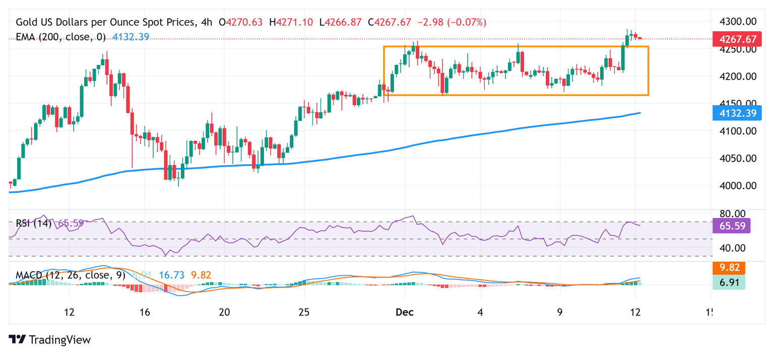 - El presidente de la Fed, Jerome Powell, dijo durante la conferencia de prensa posterior a la reunión que el mercado laboral de EE.UU. tiene riesgos significativos a la baja y que el banco central no quiere que su política afecte negativamente la creación de empleo. Esto alimentó las especulaciones sobre dos recortes más de tasas por parte de la Fed el próximo año y, a su vez, favorece a los alcistas del XAU/USD.