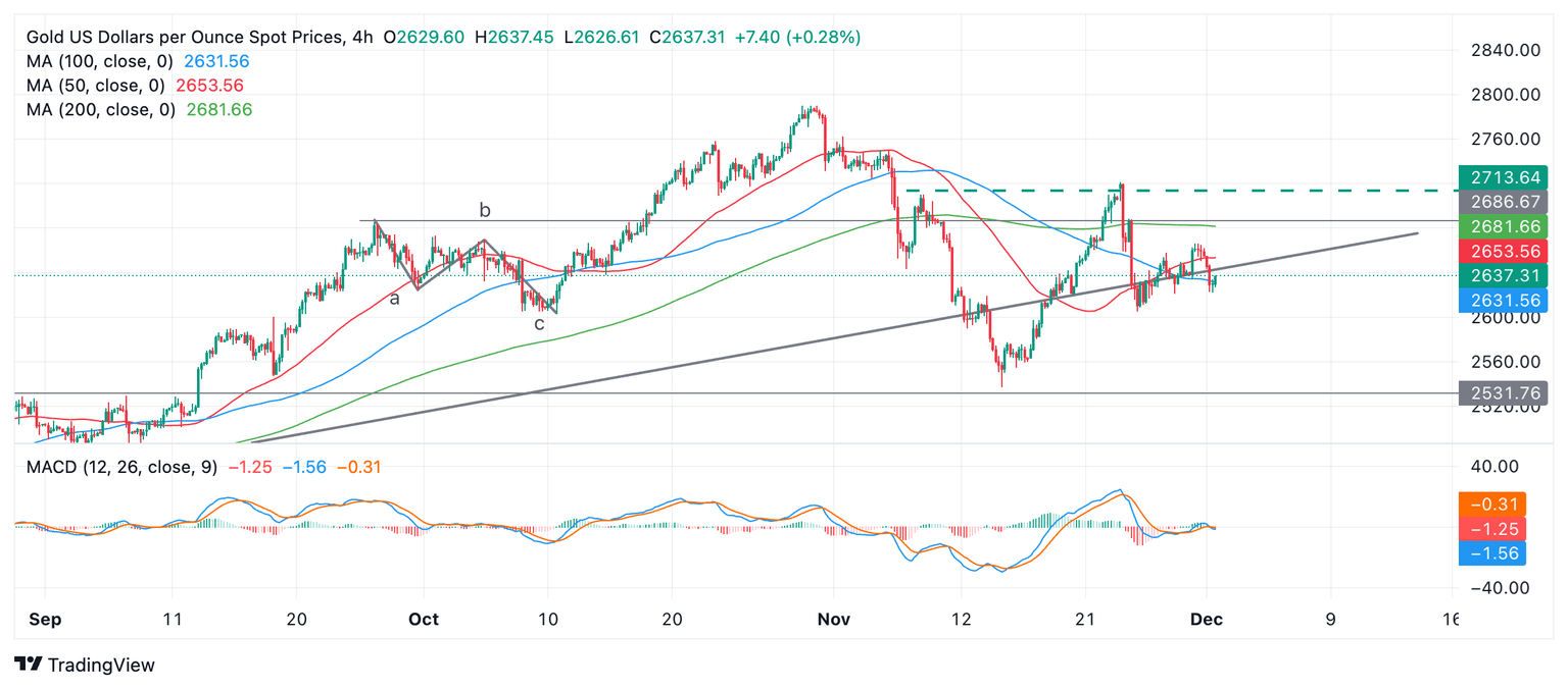 Dentro de este mercado lateral, el gráfico parece estar listo para ir a la baja. La caída desde el máximo del 25 de noviembre parece incompleta, y a pesar del soporte de la línea de tendencia, es probable que haya más bajas. Una ruptura por debajo de 2.605$ (mínimo del 26 de noviembre) confirmaría una continuación a la baja hacia los mínimos del rango en los 2.530$.