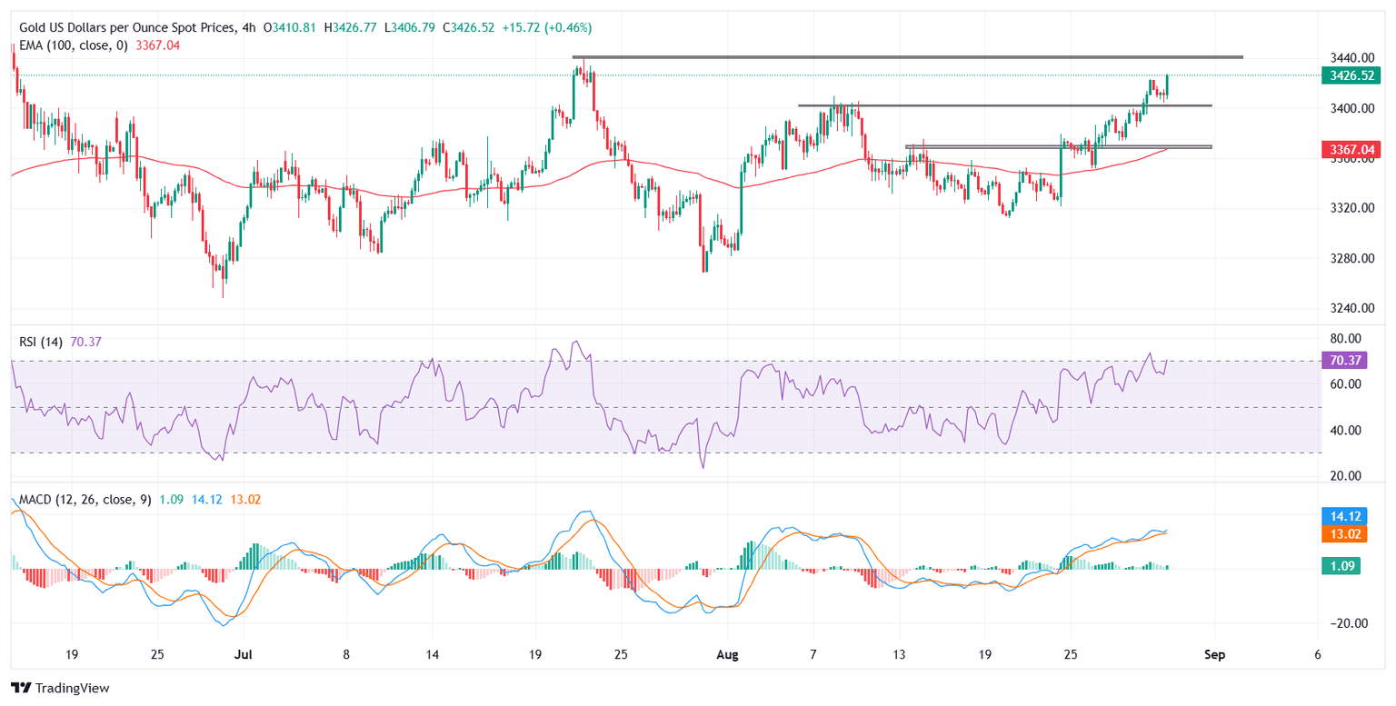 Al momento de escribir, el XAU/USD ha subido alrededor del 0,85% en el día, recuperándose bruscamente de la debilidad temprana cerca de 3.404$ en la sesión europea. El metal sigue en camino de asegurar sólidas ganancias mensuales, respaldado por flujos de refugio seguro, expectativas de política de la Fed y una persistente incertidumbre geopolítica y económica. Las preocupaciones sobre la independencia de la Fed han reforzado aún más su atractivo, y las correcciones a corto plazo probablemente se verán como oportunidades de compra en la caída dentro de la tendencia alcista más amplia.